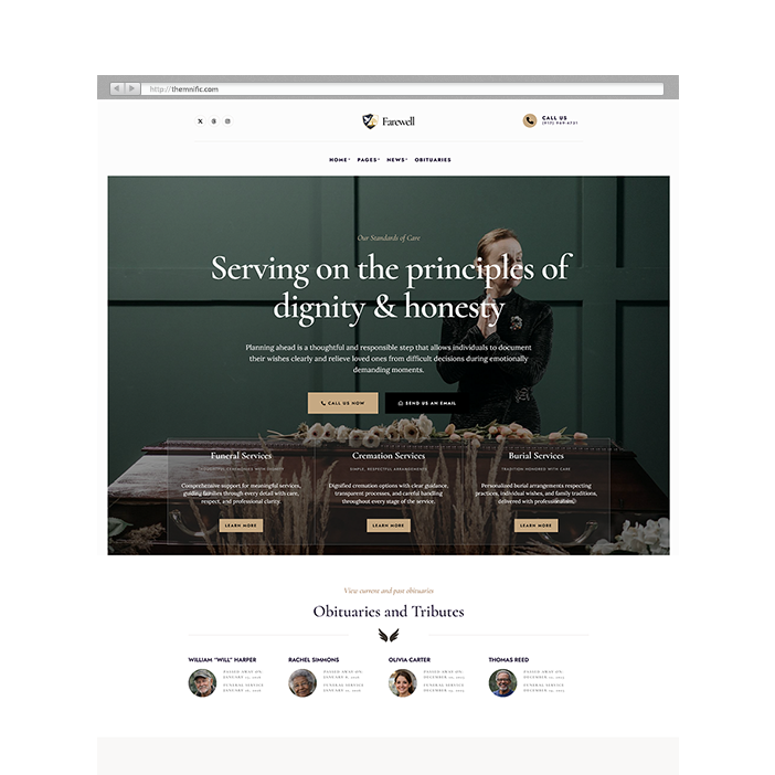 Farewell is a premium WordPress theme created for funeral homes, cremation providers, and memorial service businesses that require a calm, professional, and trustworthy online presence. Every detail is designed to support sensitive communication while delivering a modern website experience.