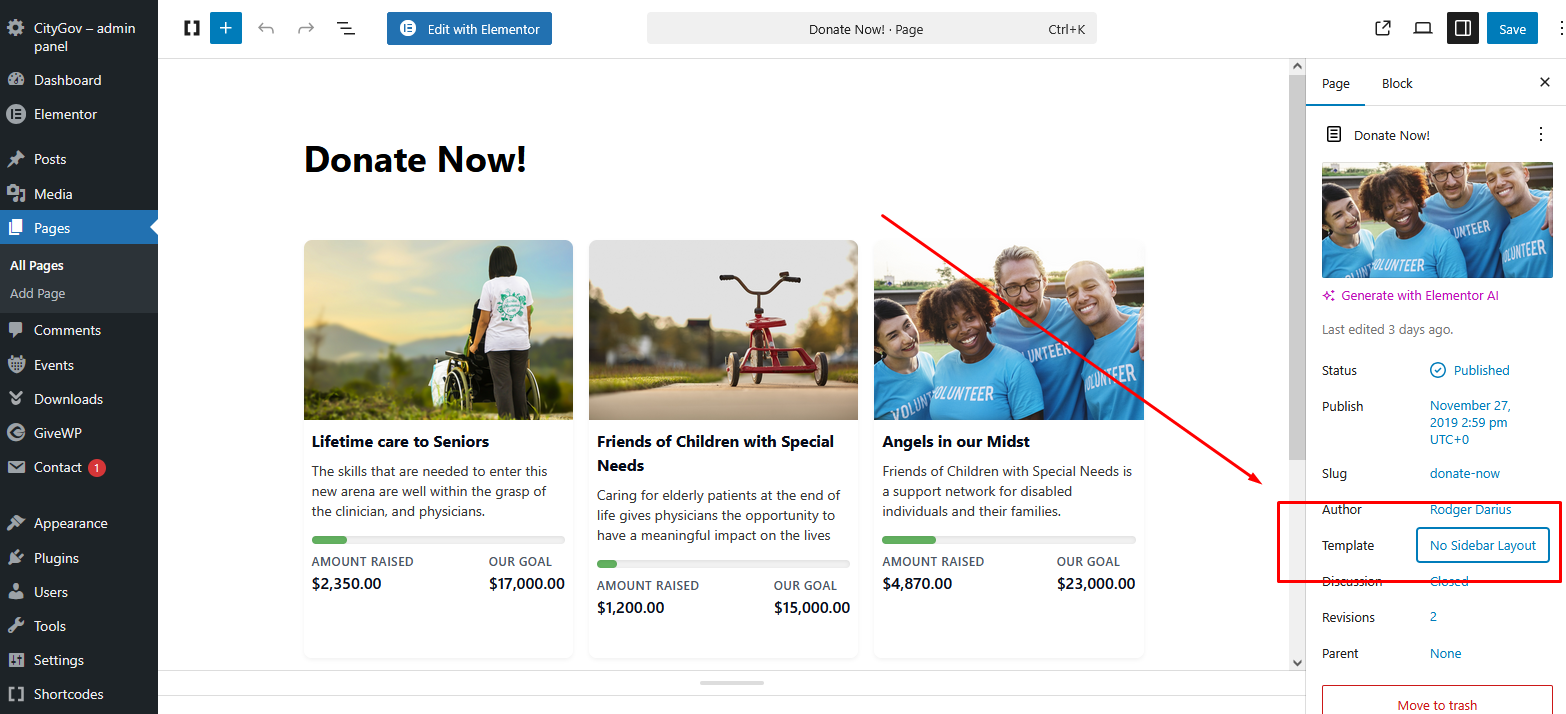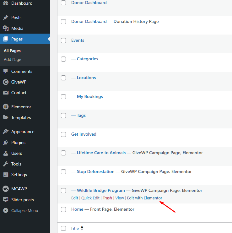 GiveWP automatically creates a frontend campaign page. It is located in 'Pages' section