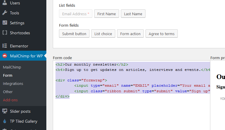 Plugin can be set in MailChimp for WP section: