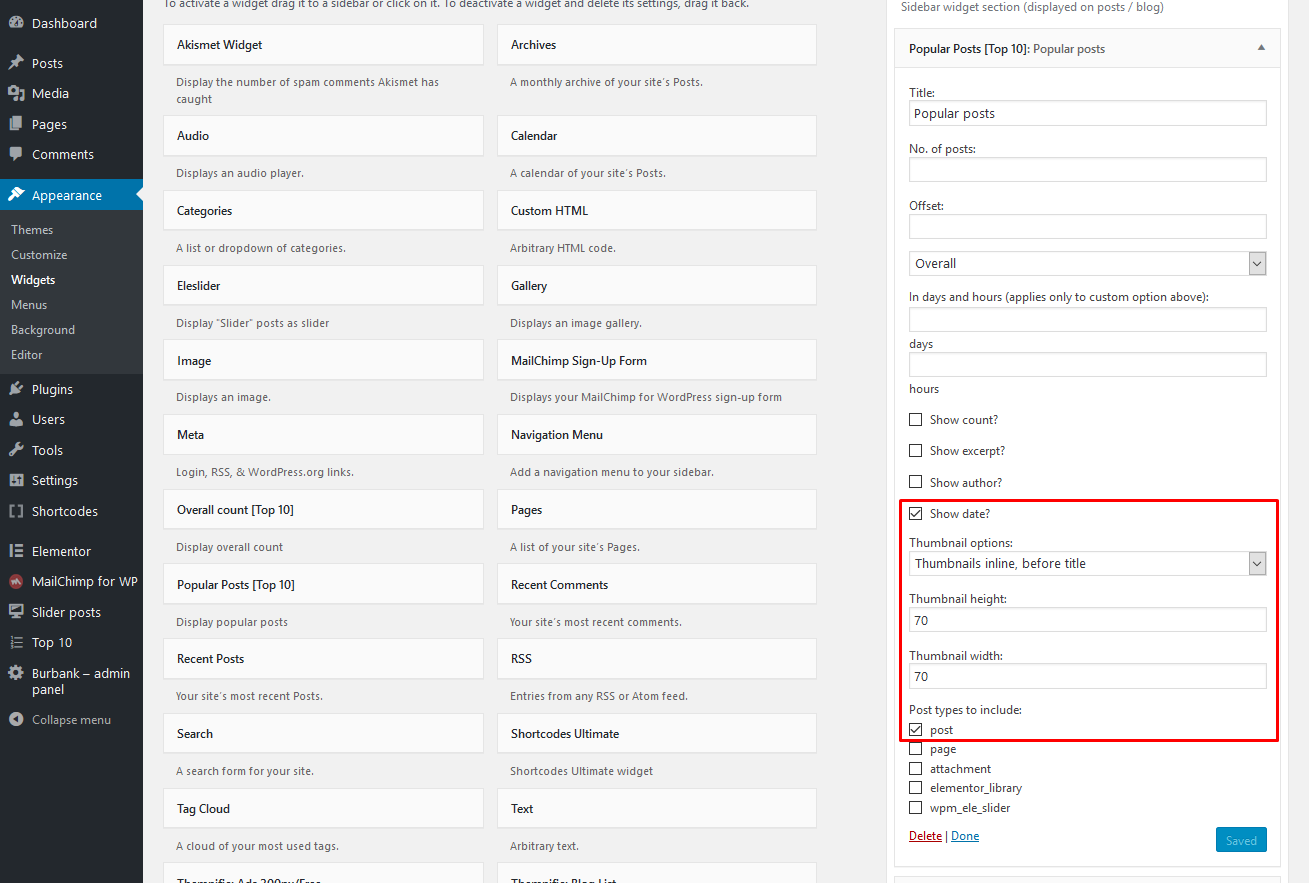 After plugin activation setup 'Popular Posts [Top 10]' widget in Appearance > Widgets with following, highlighted options:
