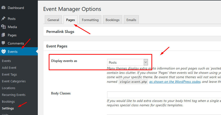 b) In Events > Setting > Pages in 'Event List/Archives' section select which page will used as an events page: