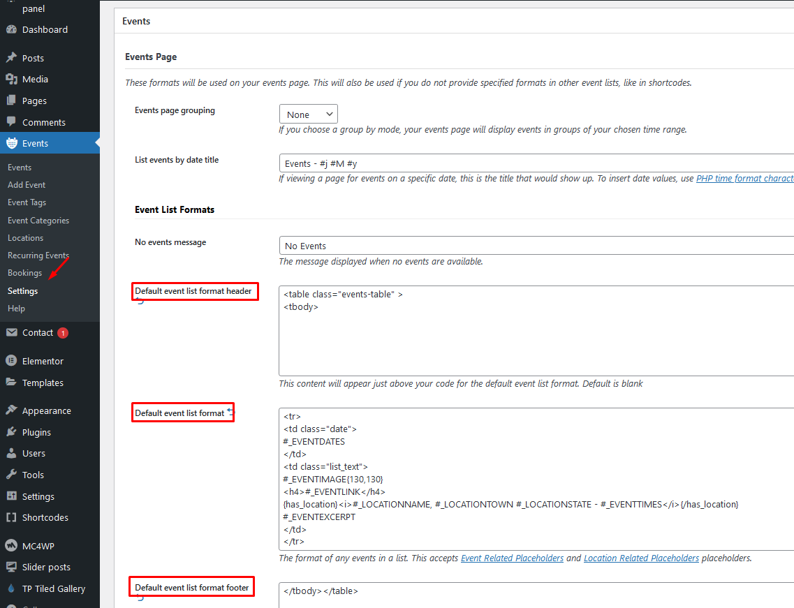 and after that paste the following code into 'Default event list format header' field: