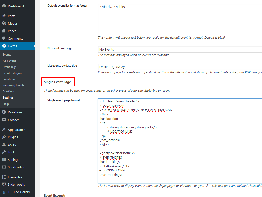 d) In Events > Setting > Formating > Single Event Page paste following code into 'Single event page format' field: